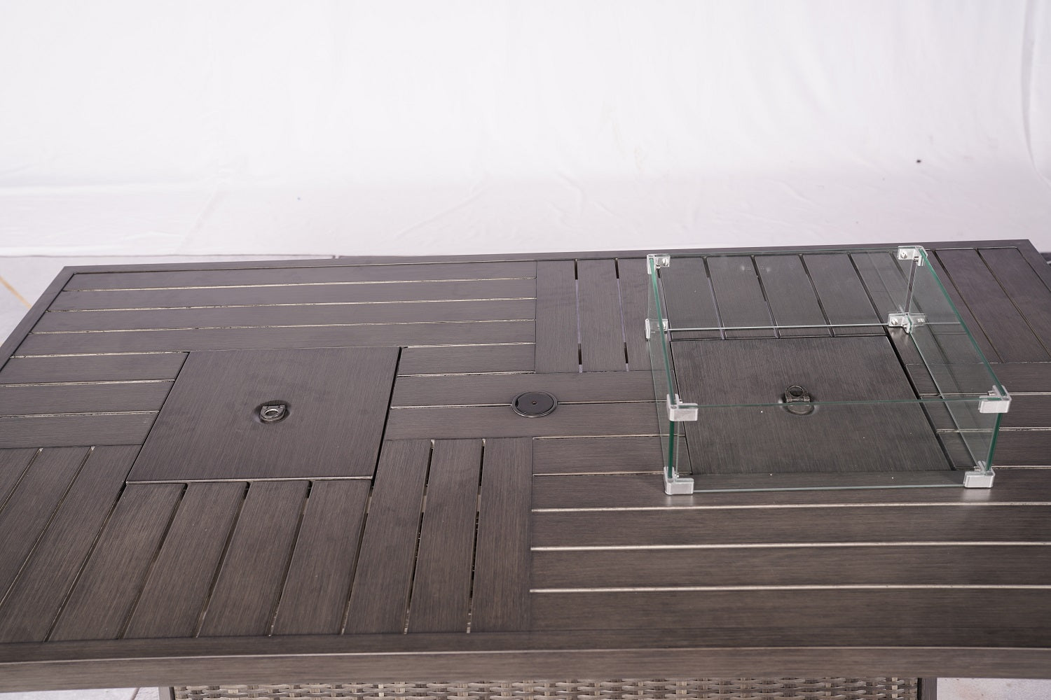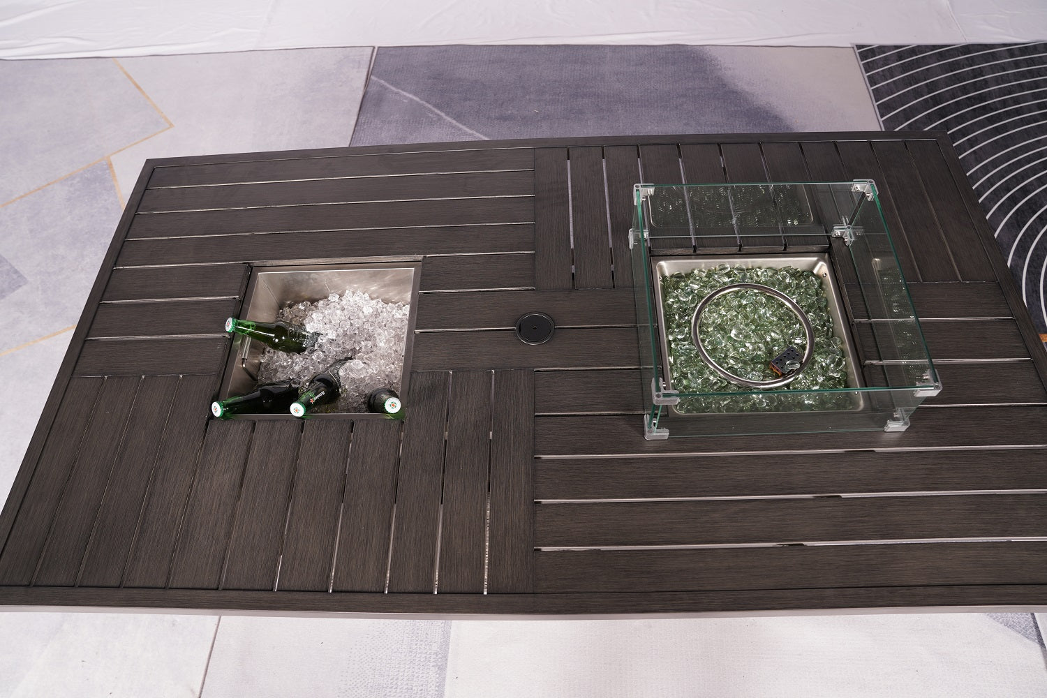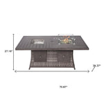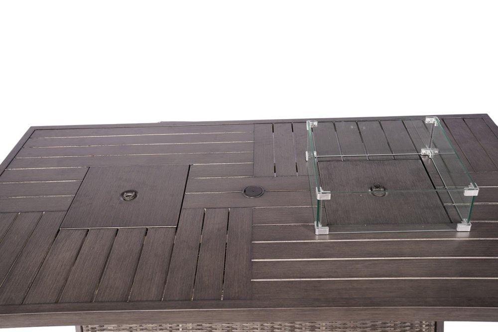 Turn the spotlight to your backyard with the Gray Wicker Outdoor Patio Gas Fire Pit Table with Ice Bucket. Built to perfection, the modern, impressive design is an excellent alternative to spending quality time with friends and family in the comfort of your home. Conveniently hidden under the table is a compartment for the propane tank (not included), while the table top displays a classic glass wind shield that protects and contains the fire but still allowing warmth. This dual hot and cold inspired table also comprises of an ice bucket section, for keeping those drinks well chilled. With the adjustable flame control, the heat can be brought down a level on those warmer nights. When firepit not in use, the extended tabletop provides a vast entertaining space for gatherings whilst elegantly resting on four splayed sturdy framed legs. Enjoy fun and special times with your loved ones with this impressive wicker fire pit table that includes a handy ice bucket. Ideal for all kinds of gatherings and would be magnificant on your covered porch or patio. 27.16" x 70.87" x 39.37"