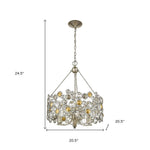 Brighten up your space with this gorgeous silver three light metal and crystals dimmable chandelier with silver shades. A silver finish, gives this light a classic and neutral tone to blend into many decor styles. This light will require hardwiring installation. Get creative and change up the look of any room from hallway, to closet, to office or bedroom with this gorgeous hanging chandelier light fixture. 24.5-inch H x 20.5-inch W x 20.5-inch D